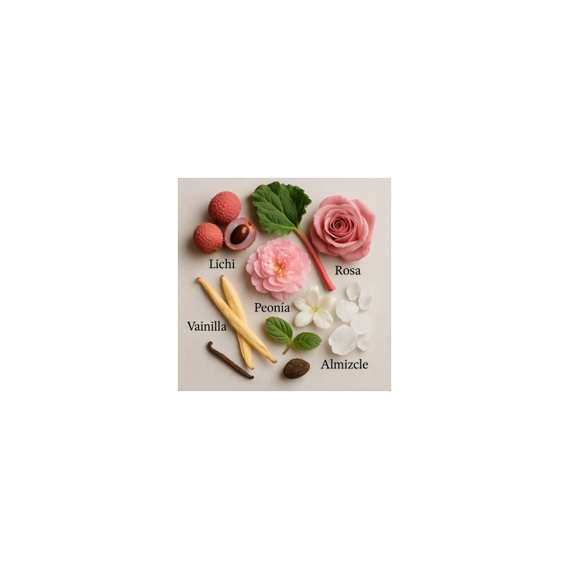 Abre-se com um acorde frutado crocante: lichia, pera e ruibarbo, realçados por um toque vibrante de bergamota e uma centelha picante de noz-moscada, preparando o terreno para uma experiência delicada e magnética.